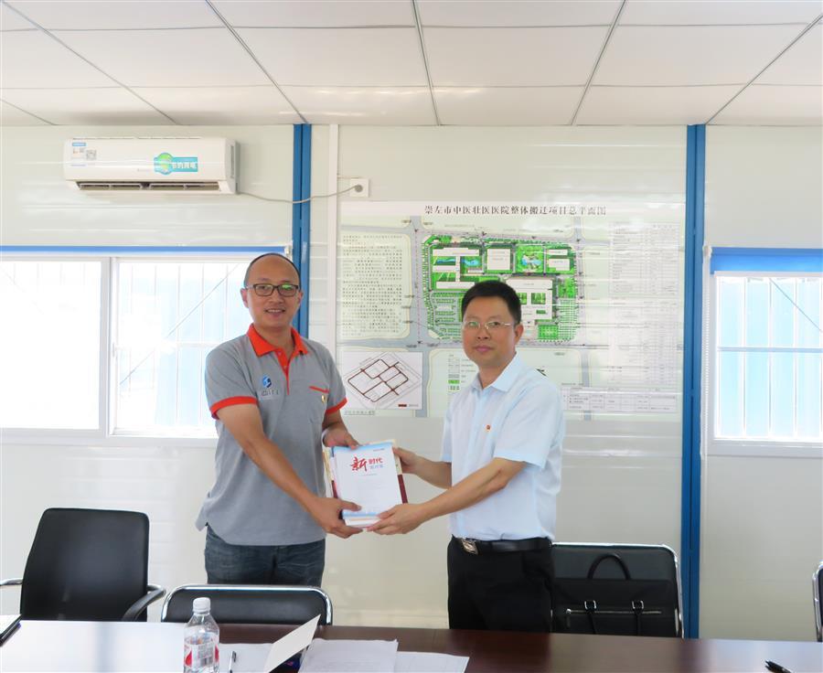 5月24日上午,公司崇左片區(qū)項目聯(lián)合黨支部揭牌儀式在崇左市中醫(yī)壯醫(yī)醫(yī)院整體搬遷項目主體工程項目部舉行,公司黨委副書記、紀(jì)委書記、工會主席賴海標(biāo)和項目聯(lián)合黨支部書記鄧牧共同為黨支部成立揭牌。揭牌儀式由公司組織人事處處長梁金峰主持。公司相關(guān)職能部門、分公司代表和崇左片區(qū)各項目部成員參加揭牌儀式。