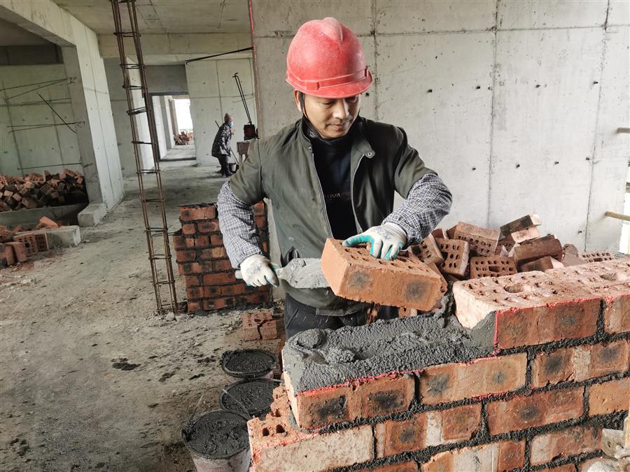 柳城靖西村棚戶區(qū)改造項目建設(shè)者在砌筑