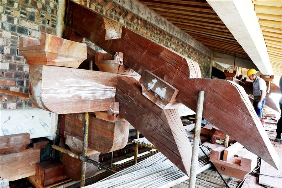 連日來,在該項(xiàng)目湖心閣斗栱安裝現(xiàn)場(chǎng),每天有20多名經(jīng)驗(yàn)豐富的木工師傅在認(rèn)真進(jìn)行斗栱安裝作業(yè)。為保證項(xiàng)目質(zhì)量,解決項(xiàng)目斗栱安裝難題,加快安裝速度,項(xiàng)目部結(jié)合實(shí)際,通過多次試驗(yàn)和優(yōu)化設(shè)計(jì),確保柱子能承受斗栱重量,采用正裝方式進(jìn)行安裝,保證了安裝速度和安裝質(zhì)量。面對(duì)項(xiàng)目選用的木制斗栱材料密度大、重量重、安裝作業(yè)工作面窄等困難,木工師傅結(jié)合自身多年的木工經(jīng)驗(yàn),克服現(xiàn)場(chǎng)施工遇到的困難,相互配合,目前已完成斗栱安裝工作量的三分之一。