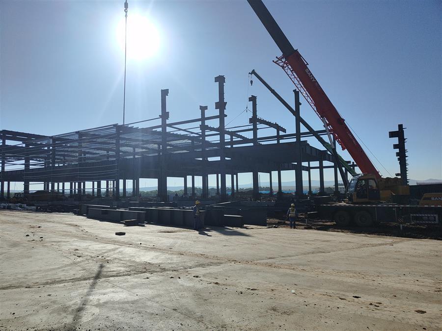 目前,該項目2#配送中心5-12軸鋼結構完成100%,正在進行1-4軸二層鋼柱牛腿焊接、6.65米鋼梁安裝及二層鋼柱安裝。2#冷庫4-12軸交E交J軸防水板混凝土澆筑完成,正在加固13-18軸地下室頂板模板,綁扎4-12軸交A交E軸防水板鋼筋。