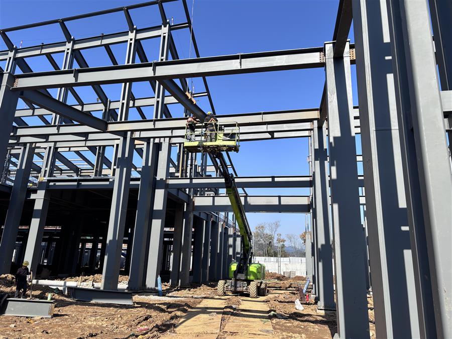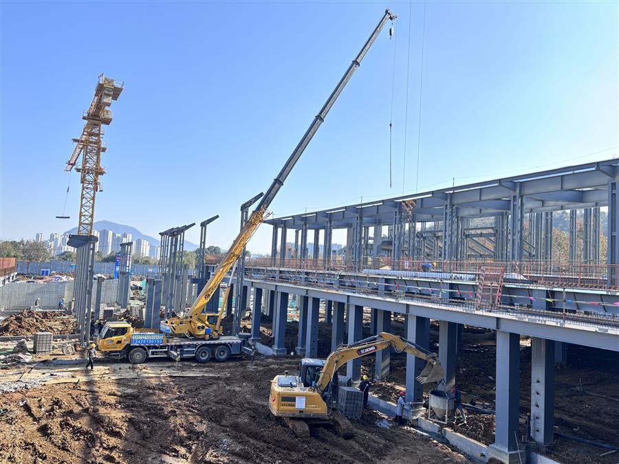 項(xiàng)目施工現(xiàn)場(chǎng),機(jī)器轟鳴,工程車輛來(lái)回穿梭,工人們?cè)诟鼽c(diǎn)位開(kāi)展墊層、樓承板澆筑、鋼筋綁扎、栓釘焊接、基礎(chǔ)砌磚、屋面底板和鋼結(jié)構(gòu)梁柱安裝等施工作業(yè),處處涌現(xiàn)“冬忙”景象。