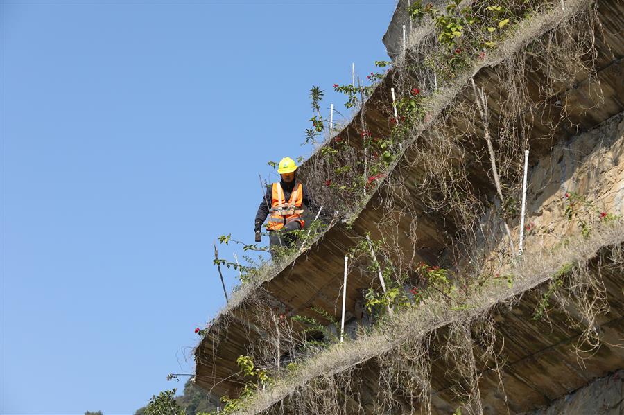 12月19日,工人在樓梯山的峭壁上養(yǎng)護(hù)綠植。