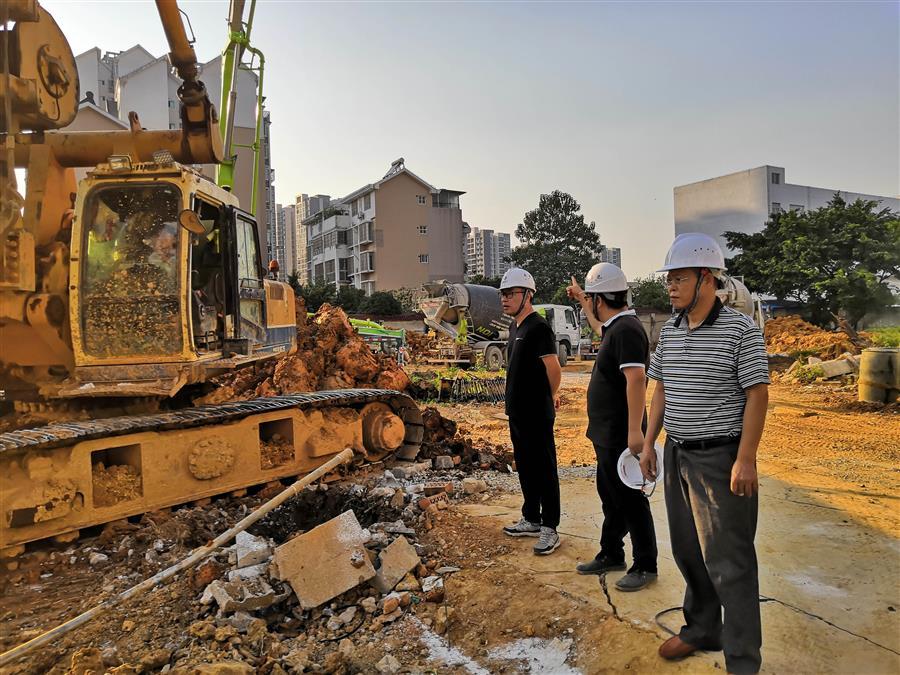 10月5日上午,桂東分公司經(jīng)理謝勇、黨支部書記黃桂軍來到柳州市防汛抗旱物資儲備倉庫工程項目現(xiàn)場慰問看望節(jié)假日仍堅守崗位的一線員工。該項目施工現(xiàn)場地質(zhì)條件復雜,容易塌孔且地下層部分為巖石層結(jié)構(gòu),施工難度大。為確保在甲方要求的工期內(nèi)完成施工,工人們節(jié)假日仍加班加點搶工期。他們腳踏黃土,頭頂著炎炎烈日,揮灑著蒸騰的汗水,以實際行動為集團公司早日躋身世界500強貢獻力量!