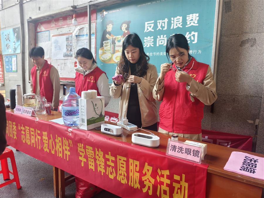活動(dòng)現(xiàn)場,志愿者們?yōu)樯鐓^(qū)居民提供清洗眼鏡、贈(zèng)送紅棗姜茶、清除小廣告、防詐宣傳等志愿服務(wù),為社區(qū)居民送去溫暖與便利。